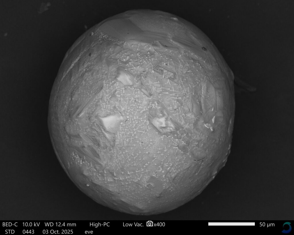 Description – When I first started searching for micrometeorites I picked out many examples like this one. It has an iron oxide composition and while there are Iron (I) – type micrometeorites they are very rarely found in urban environments. This is because most iron oxide spherules found on roofs are the result of human activity, like welding.